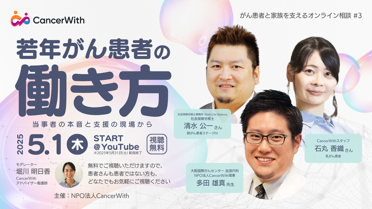 動画配信決定!オンラインパネルトーク『若年がん患者の働き方 / がん患者と家族を支えるオンライン相談#3』5/1(木)〜